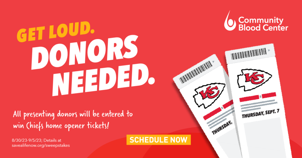 “We’d like to thank the Kansas City Chiefs for being such wonderful partners in our effort to strengthen the region’s blood supply after the holiday weekend,” said Patsy Shipley, Vice President of Community Blood Center. “We encourage all eligible blood donors to celebrate the start of football season by signing up to donate blood and saving a life, you never know if you could be the lucky winner that gets to cheer on your home team on opening day!”