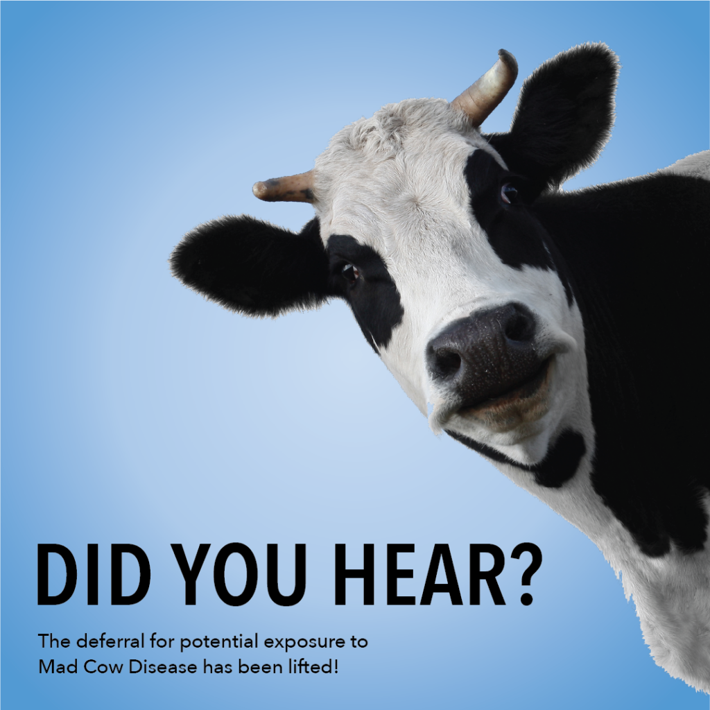 After updating computer systems and training protocols, CBC will again be welcoming donors who were previously deferred due to one of the above criteria on Wednesday, February 1, 2023. CBC is currently contacting donors with previous vCJD deferrals to inform them of their potential eligibility.